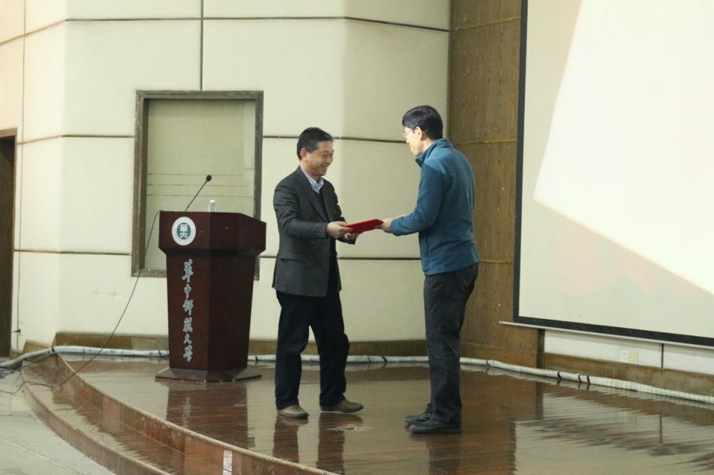 张本威院长为李向东教授颁发视界讲坛纪念牌