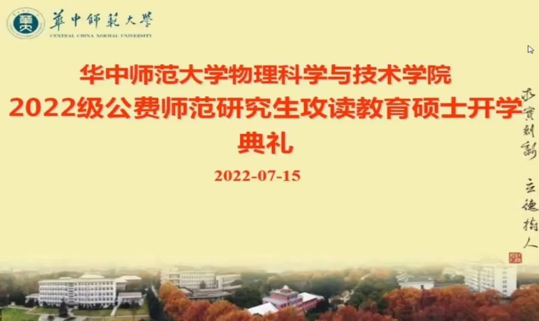 (通讯员 周雨瑾)2022年7月15日上午9点,华中师范大学物理与科学技术学院在线举行了2022年公费师范生教育硕士开学典礼。学院院长张本威教授、副院长俞云伟教授、物理教育研究所所长黄致新教授、副所长冯秀梅副教授、研究生教学秘书葛镜、研究生辅导员王秋革出席开班典礼。全体2022级公费师范生教育硕士参加典礼,典礼由研究生辅导员王秋革老师主持。