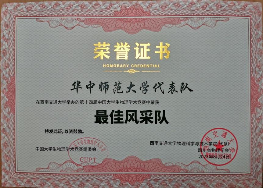 本次比赛共有全国64所高校的65支代表队参赛,几乎汇集了国内985高校及211物理强势高校。有球体育(中国)官方在线登录参赛队员加替补队员共16位同学组成的华中师范大学CUPT代表队参加了本次比赛,其中赵卓伟担任队长,杨文睿、沈黄然、梅雪仑、赵珂澜四位同学组成的团队参加了团体对抗赛。队员们不畏强手,奋力拼搏,先后与包括重庆大学、南京大学、北京师范大学等985高校在内的强手相遇。经过三天五轮比赛的激烈交锋,团队不负众望,最终以四轮比赛得分小组第一,一轮小组第二,总分192.625分,总排名第九的优异成绩,获得了团体一等奖,同时获评“最佳风采队”,创造了有球体育(中国)官方在线登录在该项赛事近七年的最好成绩。