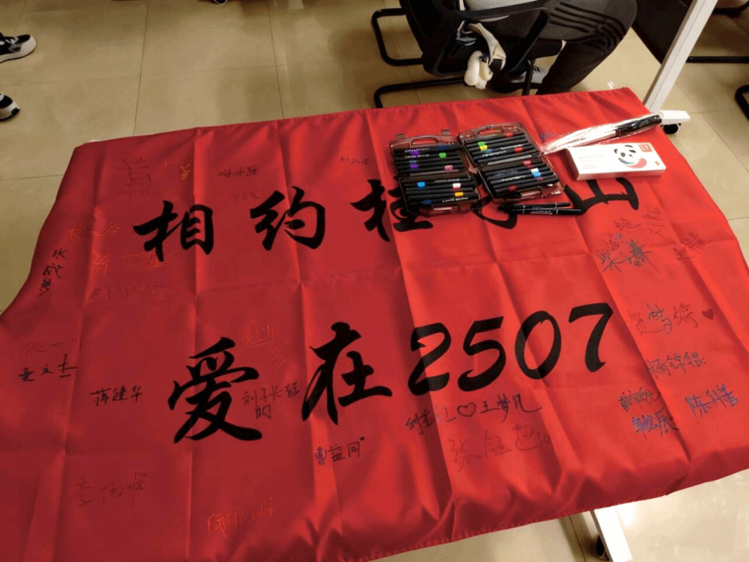在班会正式开始前,同学们依次领取2507班级定制笔,并在旗帜上写下名字,画上美食或附上图案,留下属于自己的“独家印记”。随后班委为大家分发精心准备的小零食、小惊喜。
