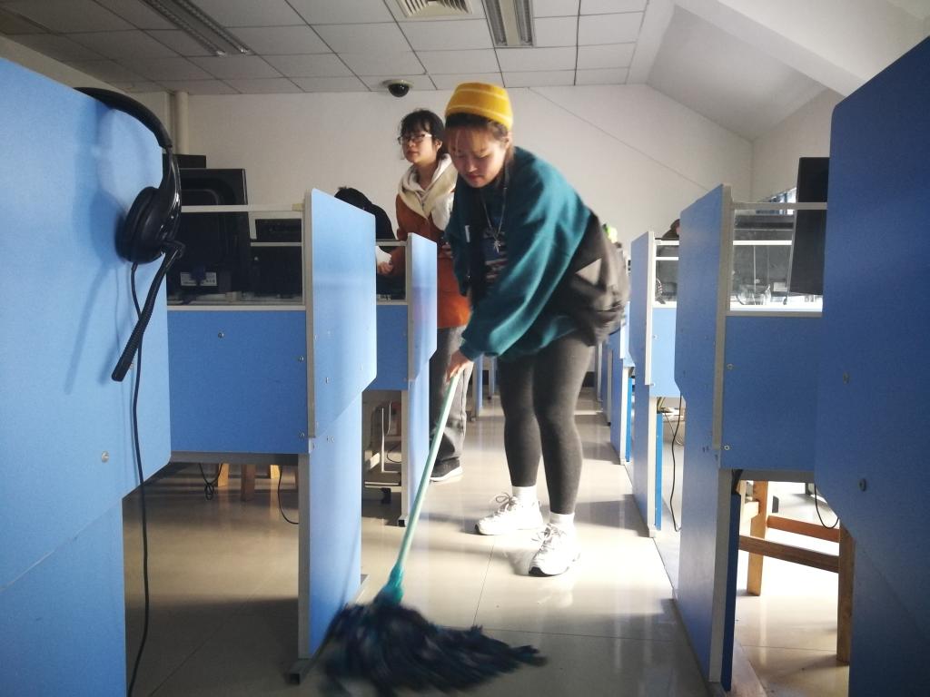 十分钟后,到达政治与国际关系学院教学楼楼下,各个班级很快地领到自己班上的清洁工具,开始了清扫活动。1810团支书程佳彦带领班级的同学们到达六楼进行清扫,她给1810班的同学做了任务分配。李琳,王茜茜,于心如,汪雅慧负责用抹布擦桌子,张雯涵,白晶晶负责扫地,其他人负责拖地。