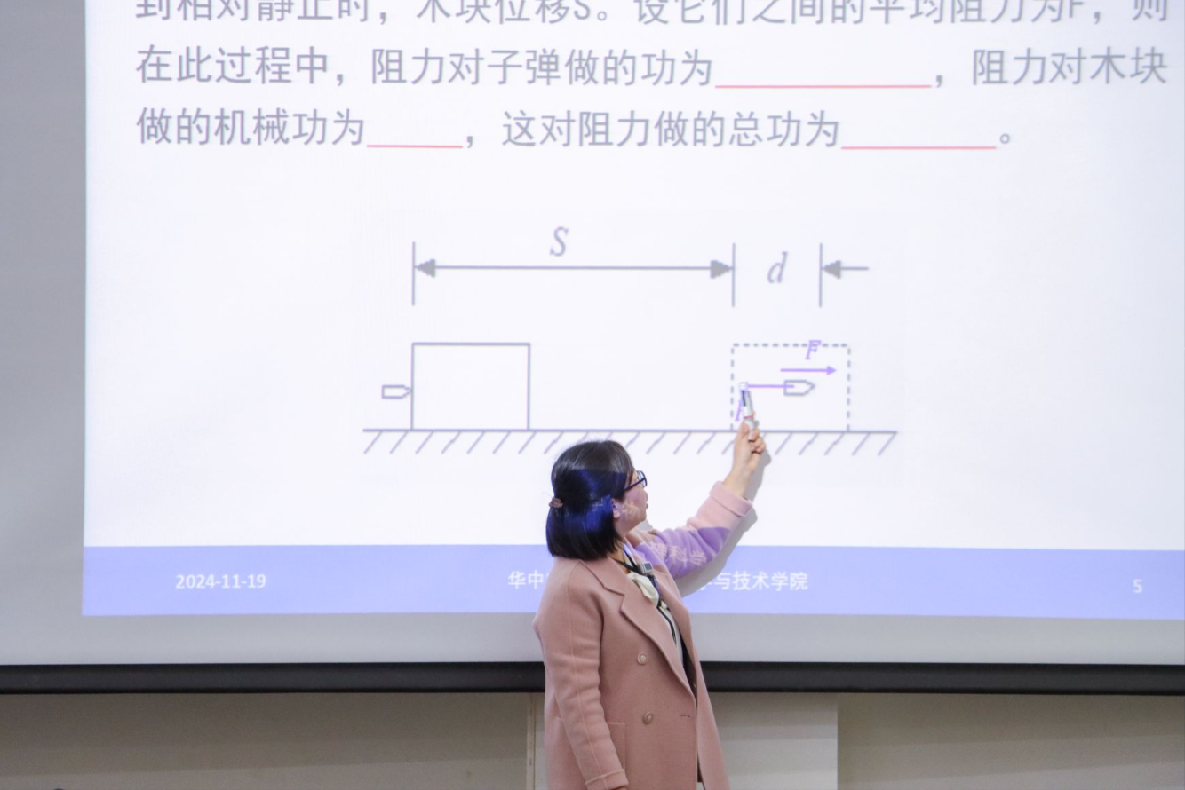 杨老师在课上带领同学们回顾了高中时期有球体育(中国)官方在线登录“功”的定义,并通过一道“子弹射入木块”的恒力做功练习题,帮助同学们巩固并深化了对该部分知识的理解。面对更为复杂的变力做功问题,杨老师详细介绍了微元法的应用。她利用微元概念,将位移分割为无数个极小段,并指出在每个极小位移上,力可视为恒力,通过计算物体极小位移与其所受力的矢量和(即元功),再对其进行积分,即可求得总功。这一方法的讲解,不仅让同学们对变力做功问题有了更为清晰的认识,也为大家解决这类问题提供了有力的工具。