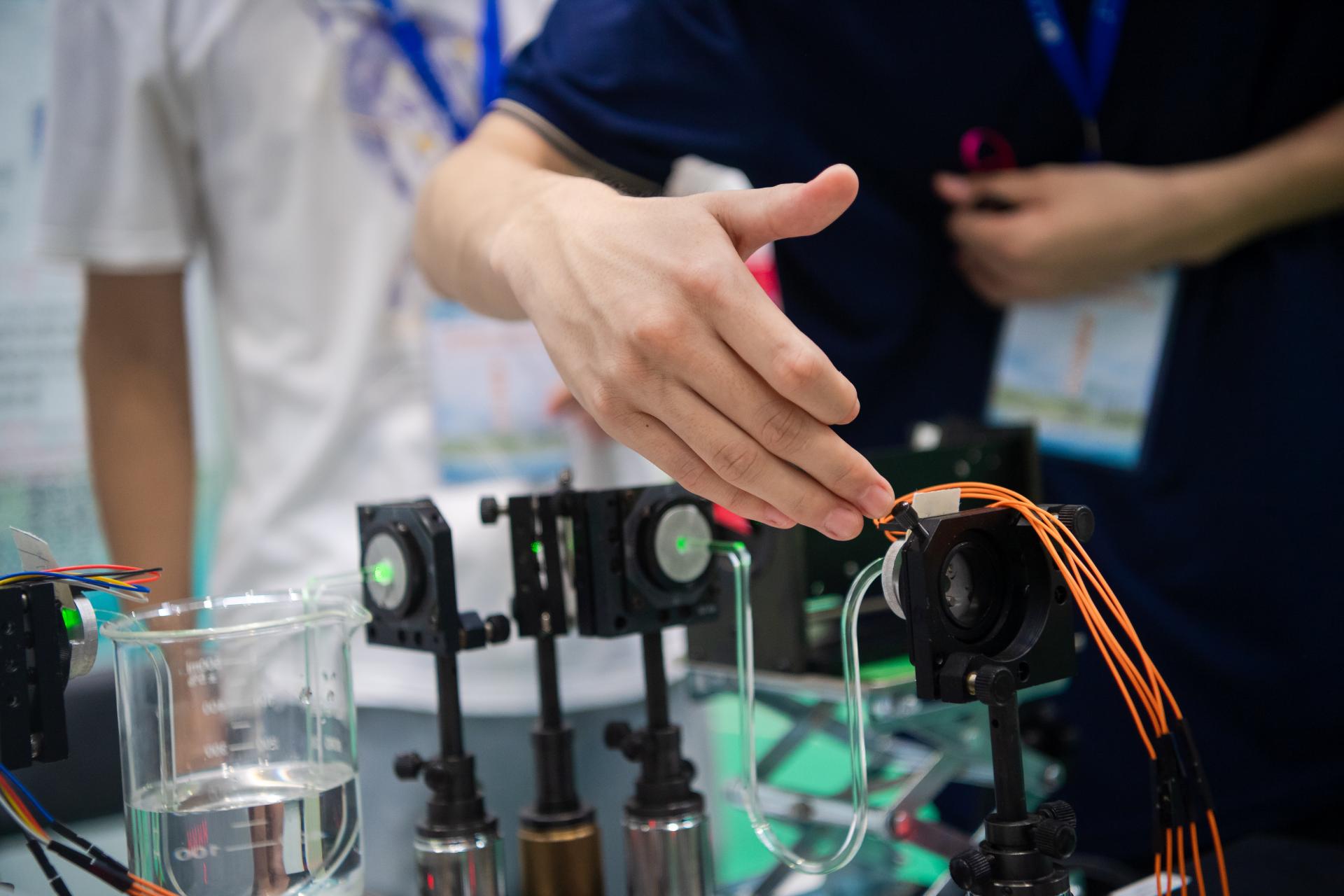竞赛现场,学生对自主设计的物理实验进行演示。