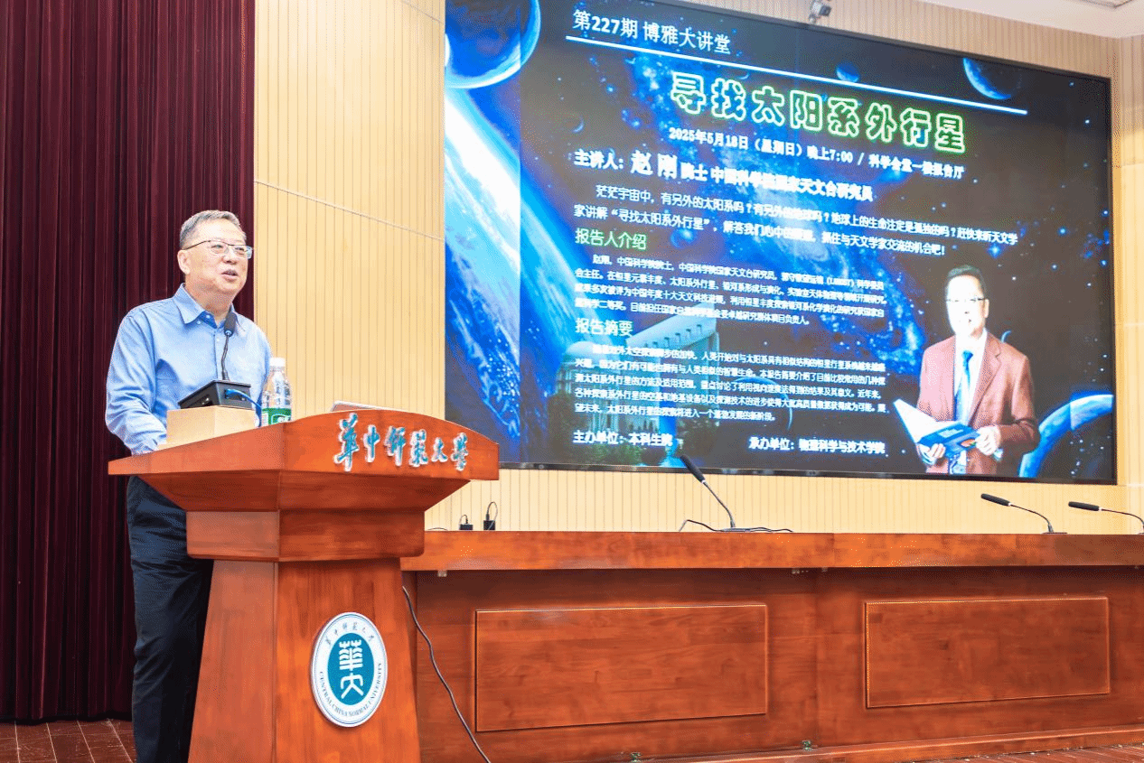 2025年5月18日,中国科学院院士、国家天文台研究员、郭守敬望远镜(LAMOST)科学委员会主任赵刚研究员应邀做客华中师范大学第227期“博雅大讲堂”,在科学会堂一楼报告厅为我校师生作题为“寻找太阳系外行星”的专题讲座。华中师范大学党委副书记陈迪明为赵刚院士颁发“博雅大讲堂”主讲人聘书,物理科学与技术学院院长秦广友主持讲座,四百余名师生到场聆听。